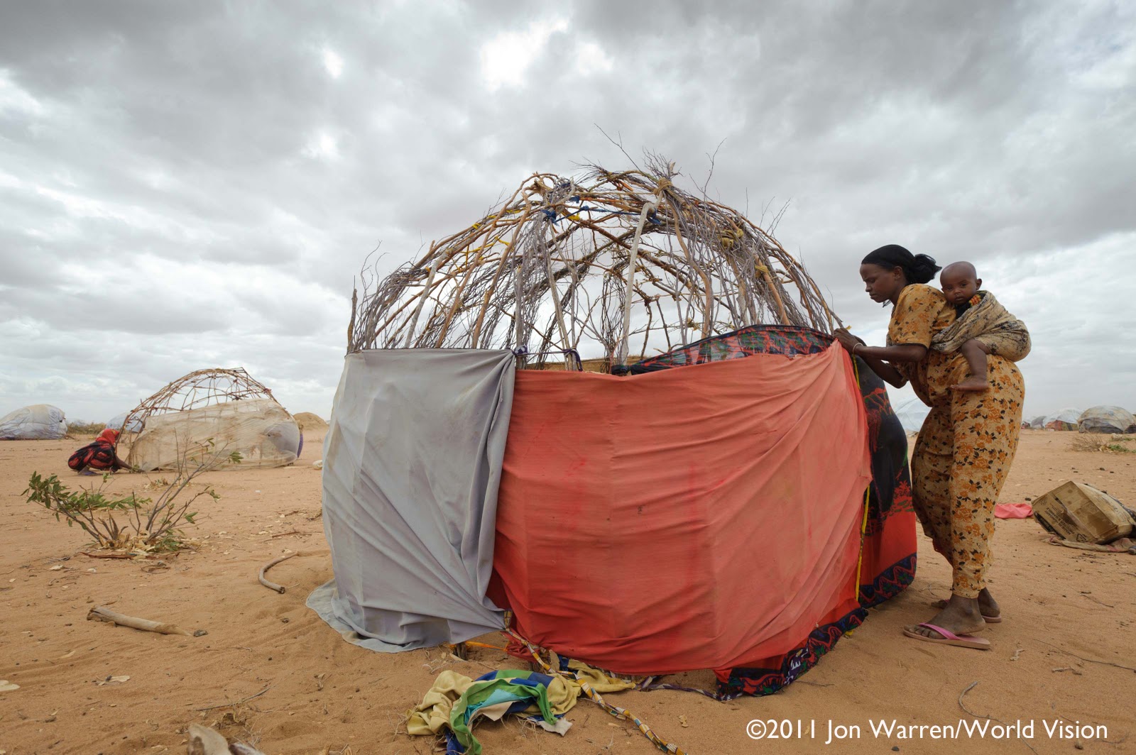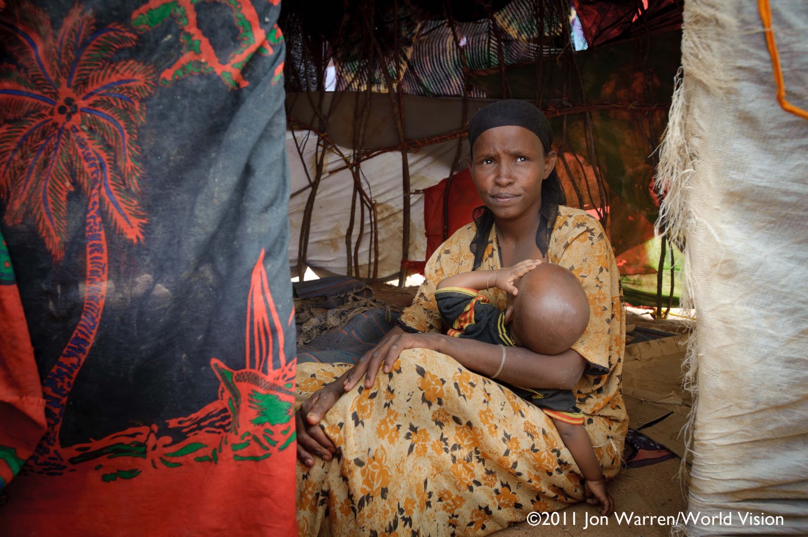 My friend and World Vision staffer, Jon Warren, was recently in Dadaab Refugee Camp in Kenya–the largest refugee camp in the world with over 400,000 people. He told me the story of Isnino Siyat, 22, a mother who walked for 10 days and nights with her husband, 1 yr-old-baby, Suleiman, and 4 yr.-old son Adan Hussein, fleeing the drought in Somalia. When she arrived at Dadaab, she built the family a shelter with borrowed materials while carrying her baby on her back. Even her dress is borrowed. As she sat in the shelter on her second night in camp she told Jon, “I left because of hunger. It is a very horrible drought which finished both our livestock and our farm.” The family lost their 5 cows and 10 goats one by one over 3 months, as grazing lands dried up. “We don’t have enough food now…our food is finished. I am really worried about the future of my children and myself if the situation continues.”